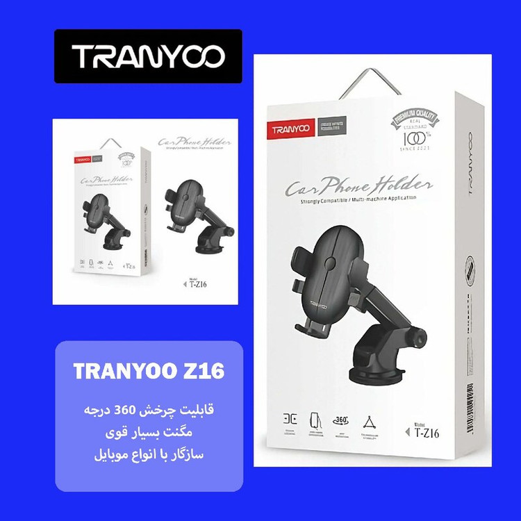 هولدر ترانیو Z16 یک پایه نگهدارنده موبایل است که برای استفاده در خودرو طراحی شده است. این هولدر به شما امکان میدهد تا گوشی موبایل خود را در حین رانندگی به صورت ایمن نگه دارید و از امکانات آن به خوبی استفاده کنید. ویژگیهای اصلی هولدر Z16 ترانیو به شرح زیر میباشد: طراحی و ساخت با کیفیت هولدر Z16 با استفاده از مواد با کیفیت بالا ساخته شده است و دارای طراحی شیک با نشان تجاری Tranyoo است. این هولدر با متریال ABS دارای مقاومت و استحکام بالایی میباشد. نصب آسان پایه نگهدارنده موبایل ترانیو مدل T-Z16 به راحتی بر روی سطوح خودرو نصب میشود. شما میتوانید این پایه نگهدارنده موبایل را به صورت افقی و یا عمودی نصب کنید و برای تنظیم زاویه نمایش موبایل خود، قلاب قابل تنظیمی دارد. استحکام و پایداری هولدر Z16 ترانیو با استفاده از مکانیزم مگنتی قوی و پایه قدرتمند خود، موبایل شما را به صورت محکم نگه میدارد. این هولدر دارای قابلیت تنظیم پایه برای استفاده بهتری است. چرخش 360 درجهای هولدر Z16 امکان چرخش کامل 360 درجه را دارد، به طوری که میتوانید زاویه دید موبایل را به دلخواه خود تغییر دهید. این ویژگی بسیار مناسب است برای مشاهده نوتیفیکیشنها، راهنمای مسیر و استفاده از برنامههای نقشه. قابل استفاده با گوشیهای مختلف این محصول با گسترهای از گوشیهای موبایل سازگار است. هولدر ترانیو قابلیت تنظیم طول و عرض را دارد و به راحتی با انواع گوشیهای آیفون و سامسونگ سازگار است.