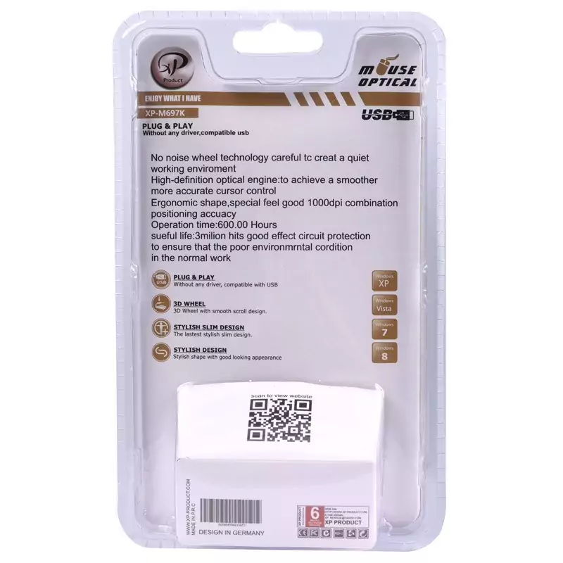 ماوس باسیم XP مدل M697 توسط شرکت اکس پی طراحی شده که از کیفیت ساخت بالایی برخوردار است و آزادی تحرک و راحتی هر چه بیشتر را برای شما به ارمغان میآورد. طراحی این موس به شکل ارگونومیک است و امکان کار با هر دو دست را برای کاربر فراهم میکند و همچنین بدون هیچگونه مشکلی بر روی تمام سطوح عمل می کند. این ماوس دارای 2 کلید و 1عدد اسکرول می باشد و همچنین حسگر آن از نوع اپتیکال است. ابعاد ماوس M697 نسبتا بزرگ در حدود 27 × 62 × 105 میلیمتر می باشد