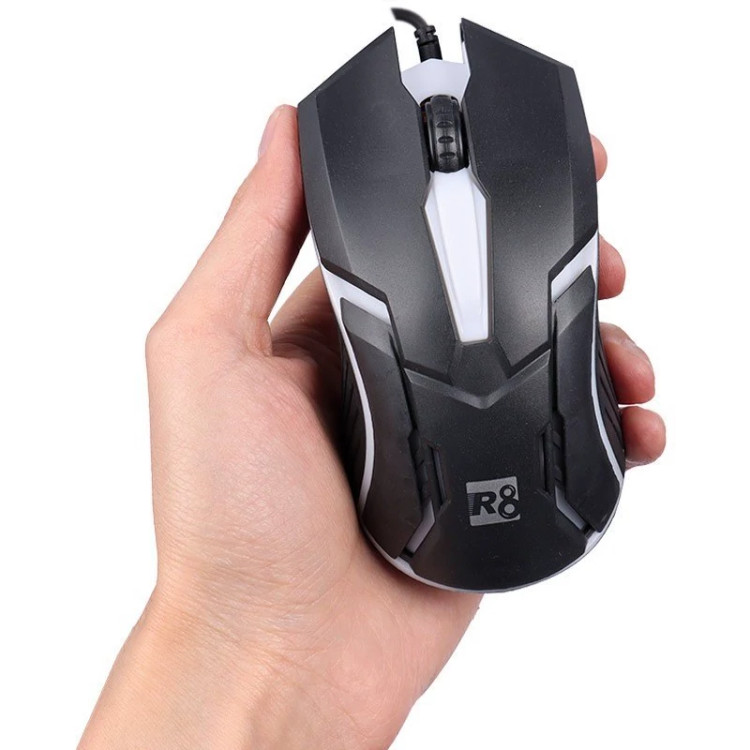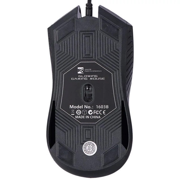 ماوس گیمینگ مدل R8 1603B مجهز به کابل با رابط USB به طول 125 سانتی متر ، برخورداری از طراحی ارگونومیک جهت جلوگیری از خستگی دست، مجهز به حسگر اپتیکال با میزان دقت تا 1000 نقطه بر اینچ و مجهز به نورپردازی داخلی RGB جهت ایجاد جلوه بصری زیبا در محیط کم نور و تاریک است.
