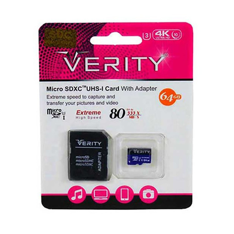 کارت حافظه میکرو اس دی 64 گیگابات وریتی به همراه اداپتور - Verity Class10 UHS-I U3 80MBps microSDHC With Adapter 64GB