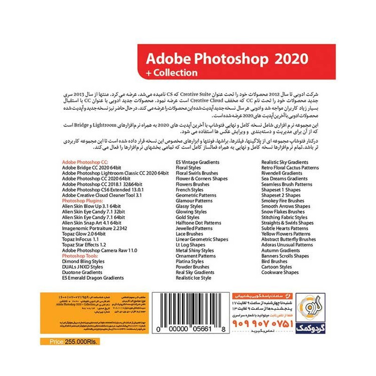 Adobe Photoshop CC Collection 2020 1DVD9 گردو Adobe Photoshop 2020 + Collection + Plugins + Photoshop Tools شماره مجوز: 16-0107-071959 مرجع صادر کننده: وزارت فرهنگ و ارشاد اسلامی تعداد: 1 قابلیت نصب بر روی: ویندوز 10 , ویندوز 8.1 , ویندوز 7 کاربرد نرم افزار: گرافیکی کد محصول: 2933 شامل نسخه های مختلف نرم افزار فتوشاپ به همراه نسحه نهایی 2020نصب آسان و فعال سازی بدون نیاز به اینترنتشماره شناسنامه اثر :071959-0107-16قیمت پشت جلد : 25500 تومان